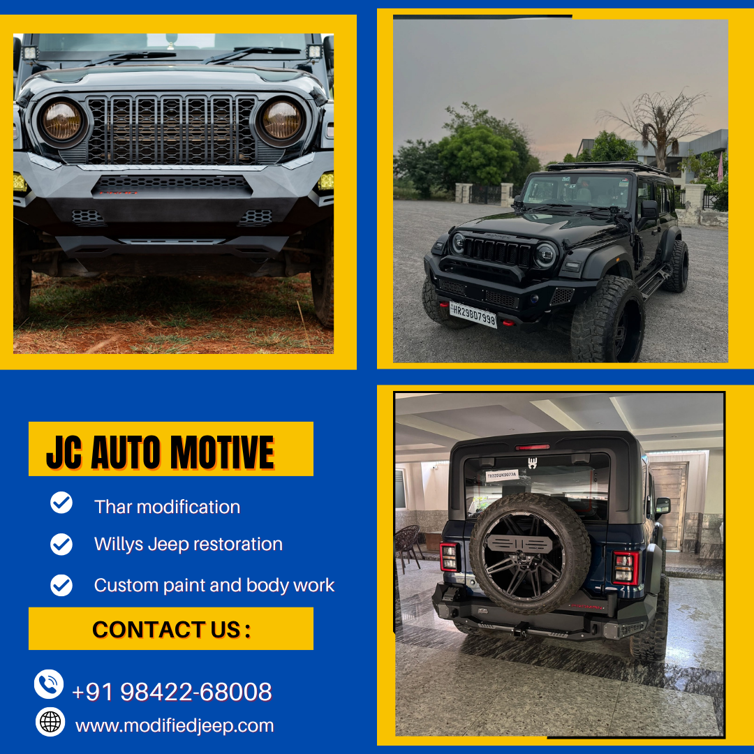 Mahindra Thar 3-door accessories, Thar mods India, Thar bumper upgrade, JC Automotive Coimbatore, Thar hardtops, Thar LED lights, ModifiedJeeps.com, Thar 4x4 accessories, Coimbatore Jeep shop, Thar side steps, Thar interiors, off-road Thar parts, Bimbra Thar parts, Thar fog lamps, Thar grill upgrade, Thar metal bumpers, Thar roof carrier, Thar seat covers, premium Thar mods, Tamil Nadu Thar shop