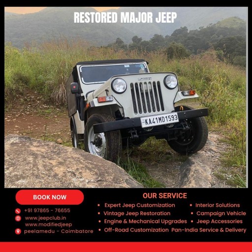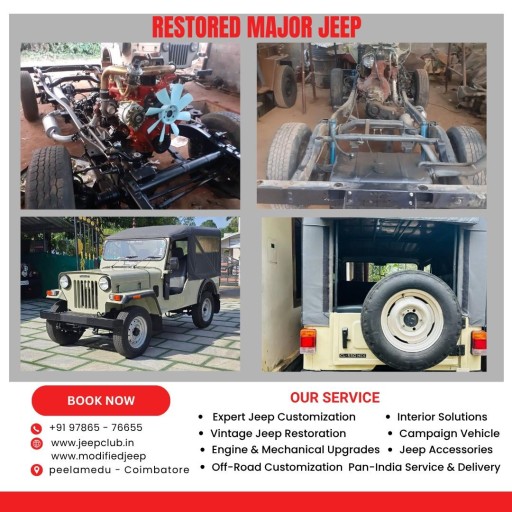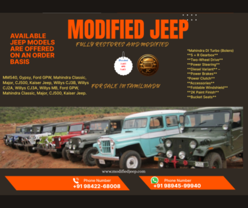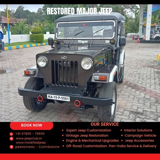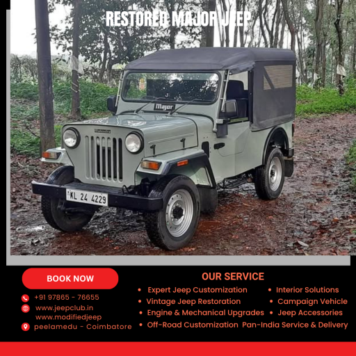 JC Automotive Modified Jeep in Peelamedu, Coimbatore, offers custom-built Mahindra Major Jeeps for sale across Tamil Nadu. Each Major Jeep is rebuilt with precision, blending rugged off-road capability with stylish street appeal. Our customization includes FRP and metal hardtops, premium interiors, off-road bumpers, suspension upgrades, and modern lighting. Ideal for collectors, off-roaders, and Jeep enthusiasts, every build is road-ready and trail-tested. Call +91 9894599940 or 9842268008, visit www.modifiedjeep.com or www.jeepclub.in, and follow @modifiedjeepsindia on YouTube, Facebook, and Instagram for the latest listings.At JC Automotive Modified Jeep in Peelamedu, Coimbatore, we take the iconic Mahindra Major and give it a new