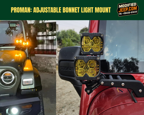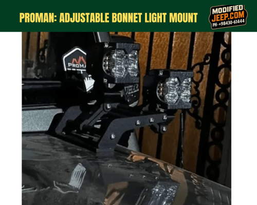 At JC Auto Motive Coimbatore, we install and supply premium lighting mods under our ModifiedJeep.com brand, ensuring factory-quality finish and compatibility. Whether you’re tackling night trails or upgrading your Thar’s road presence, the PROMAN bonnet light mount offers easy adjustability, rust-free performance, and strong vehicle integration. This is a must-have accessory for every off-road and SUV enthusiast across Tamil Nadu.